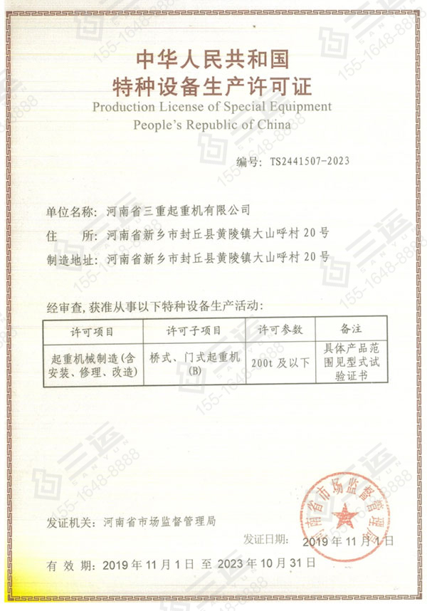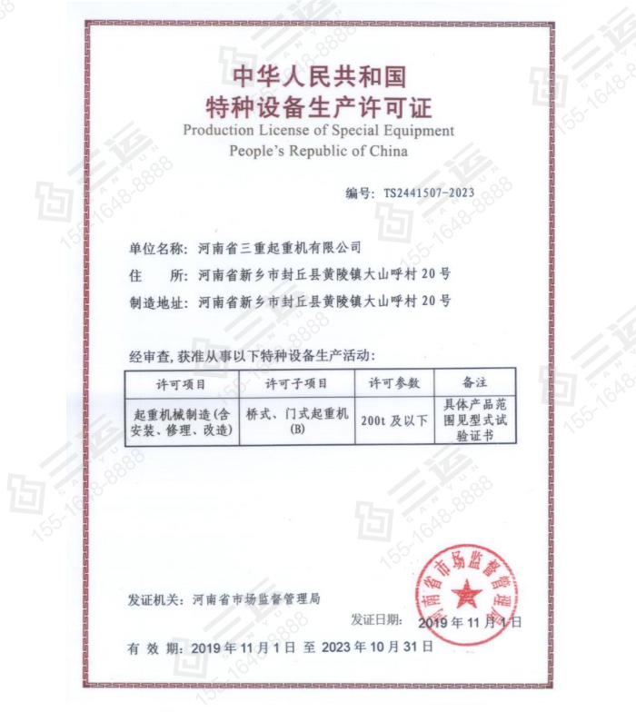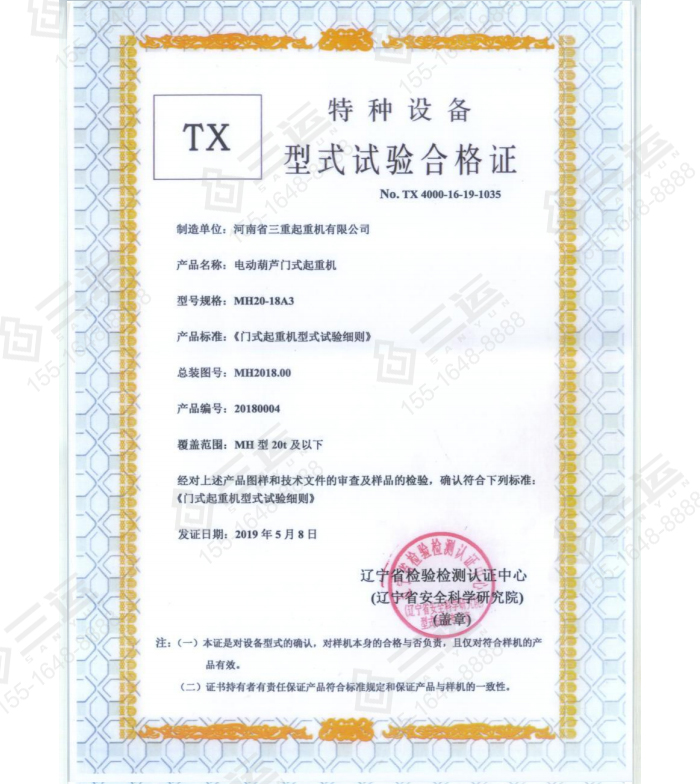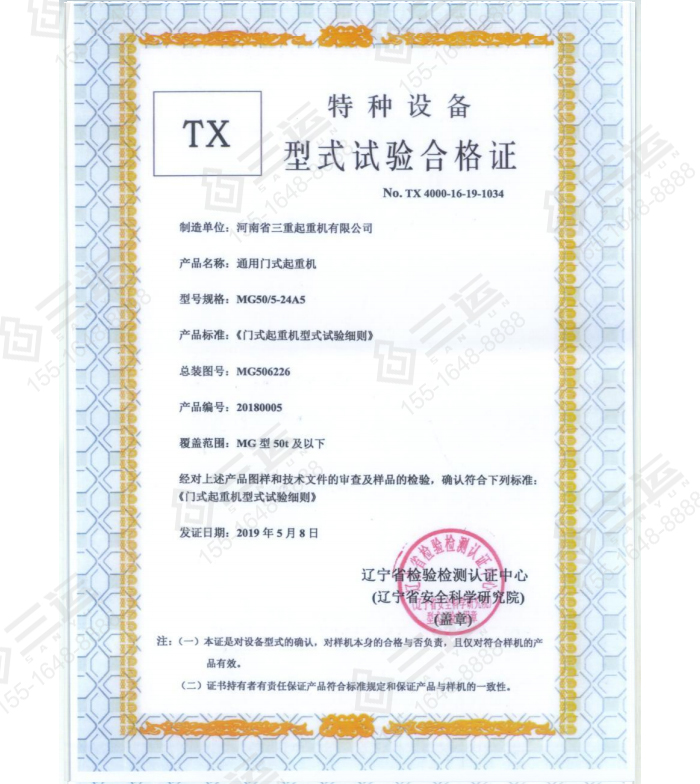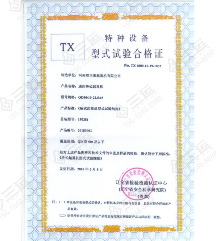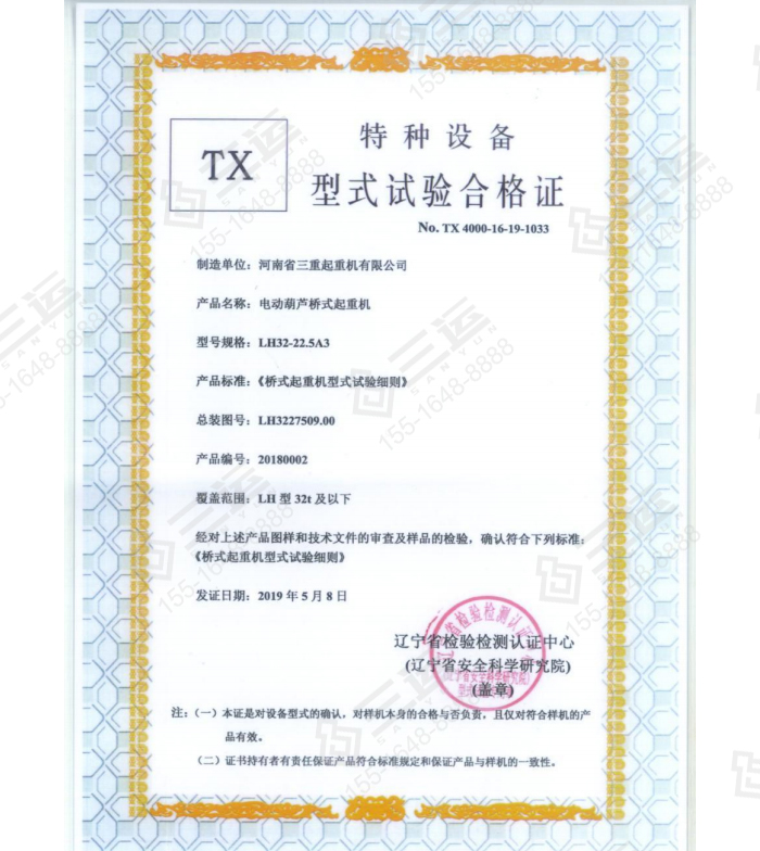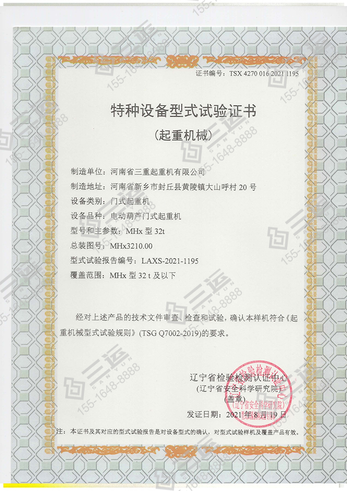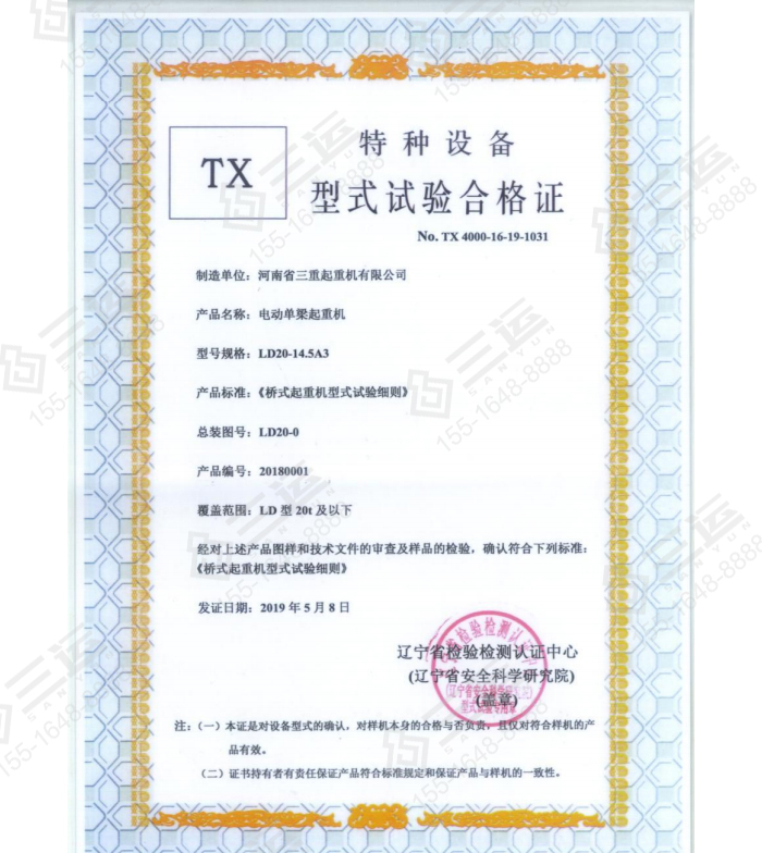 電動(dòng)單梁起重機(jī)特種設(shè)備型式試驗(yàn)合格證